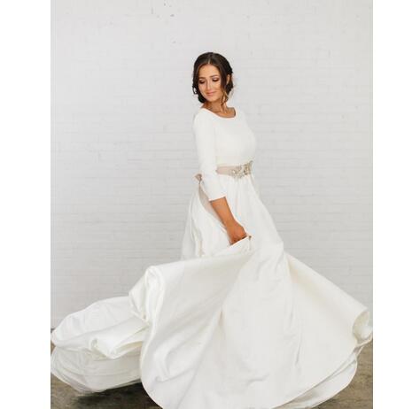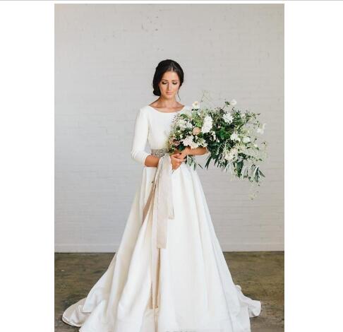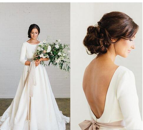 Newest Country Wedding Dresses Dusty Rose Ribbon Sash Crystal Beaded Simple Backless 3/4 Long Sleeves Wedding Gown