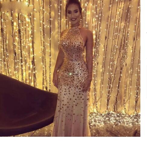 Champagne Long Evening Gowns Halter Sparkling Beaded Crystal Illusion Neck Birthday Party Gown