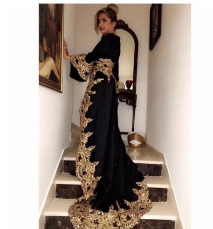 Saudi Arabic Black Velour Evening Dresses With Puff Full Sleeves Shiny Gold Lace Long Sexy Prom Gowns Split Robe De Soiree