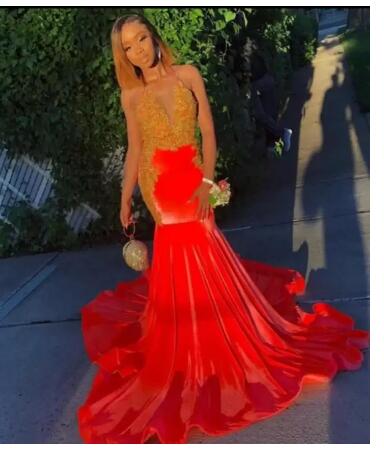 Sexy Red Gold Long Mermaid Prom Dresses New Sleeveless Sweep Train Velvet Halter Neck Formal Evening Dress Party Gowns