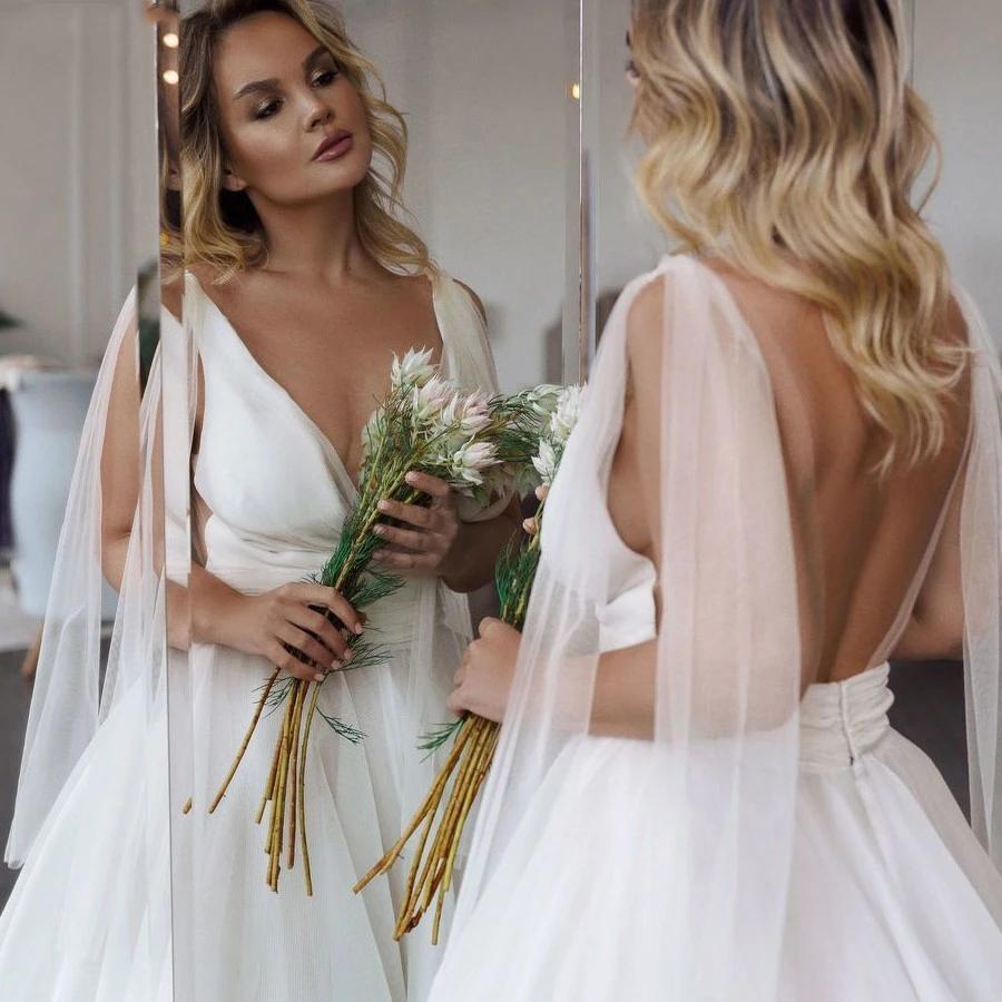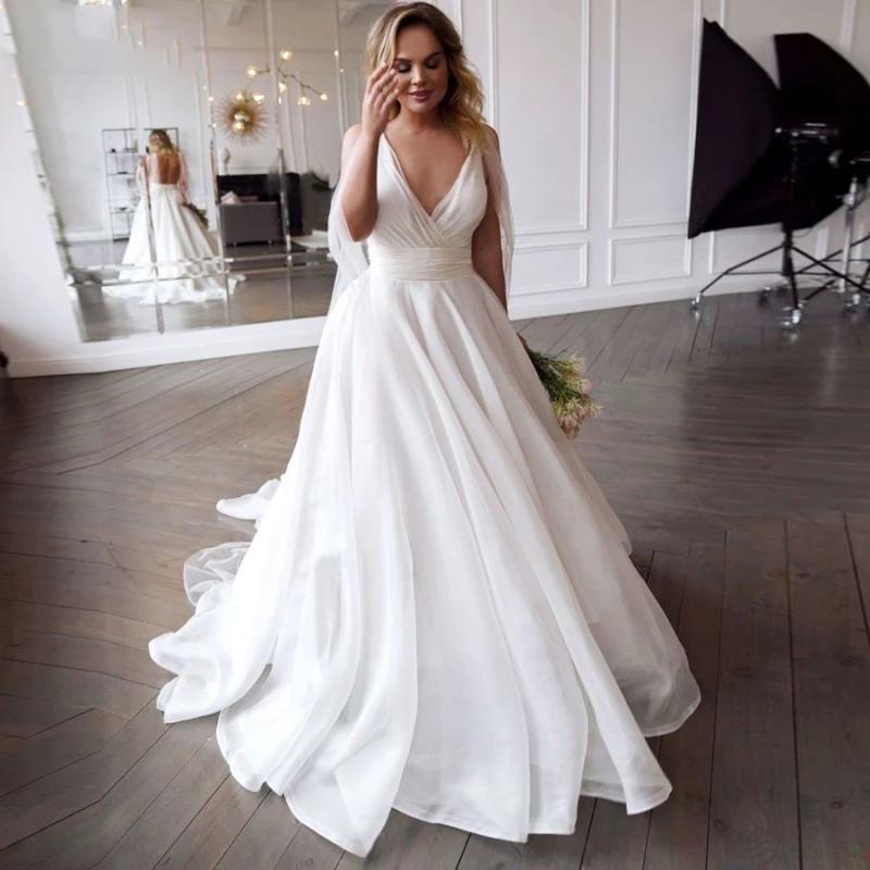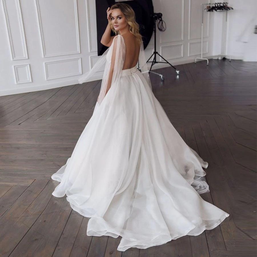 Sexy Backless Organza Beach Wedding Dresses A-line Bridal Gown Sexy Open Back Deep V Neck Marriage Gown