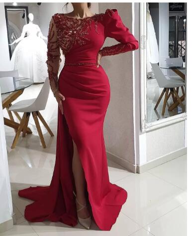 Arabic Aso Ebi Red Luxurious Mermaid Evening Dresses Beaded Crystals Prom Dresses Long Sleeves Formal Party Second Reception Gowns