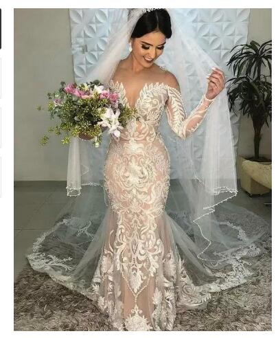 Champagne Wedding Dresses Boho Elegant Lace Mermaid Wedding Dress Illusion Neck Long Sleeves Country Garden Bridal Gowns