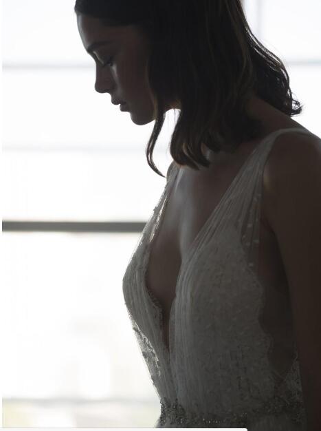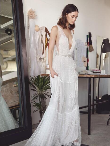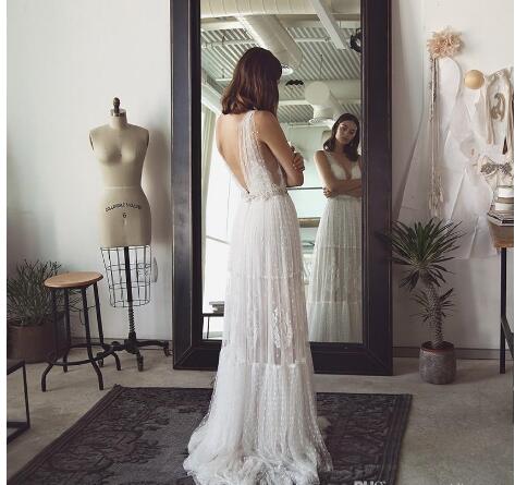 Bohemian Lace Wedding Dresses Deep V Neck A Line Backless Beach Wedding Dress Sweep Train Tulle Boho Bridal Gowns