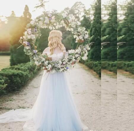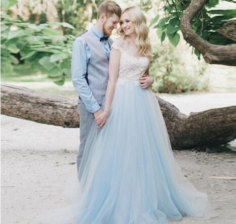 White Lace Blue Tulle Wedding Dresses Cap Sleeve Sheer Neck Bridal Gown V Backless Rustic Bride Dresses Bohemia Court Train Wedding Gown