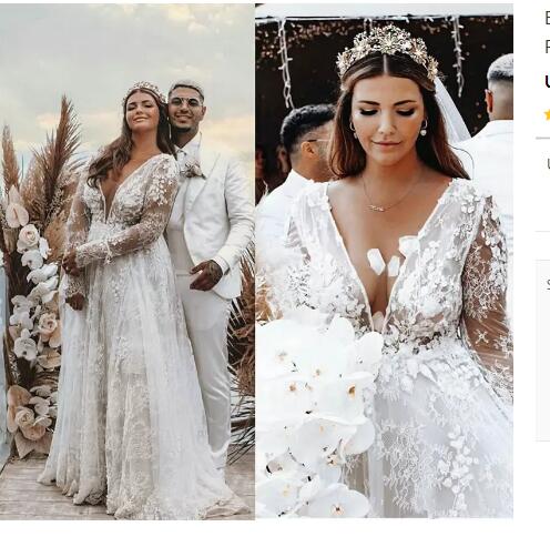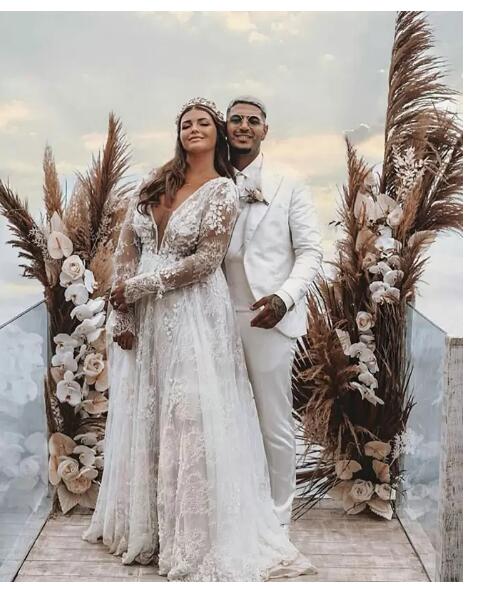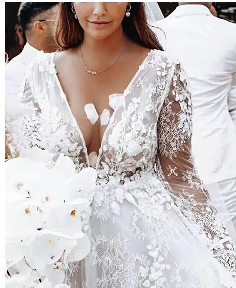 Bohemian Plus Size Wedding Dresses with Long Sleeve Sexy Deep V-neck Lace Floral Bohemian Beach Bride Robes Gown vestidosGownp Train vestido d
