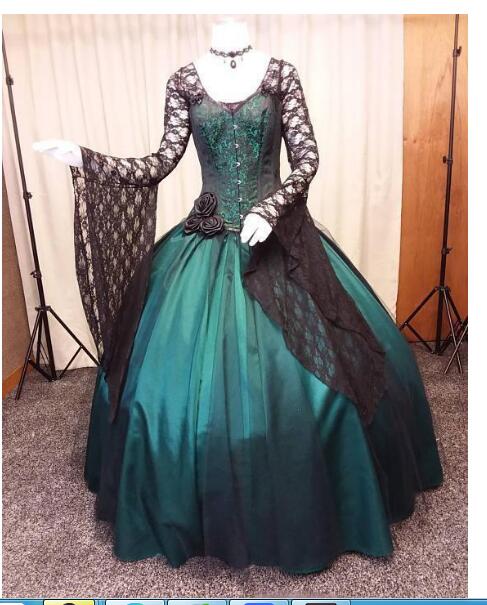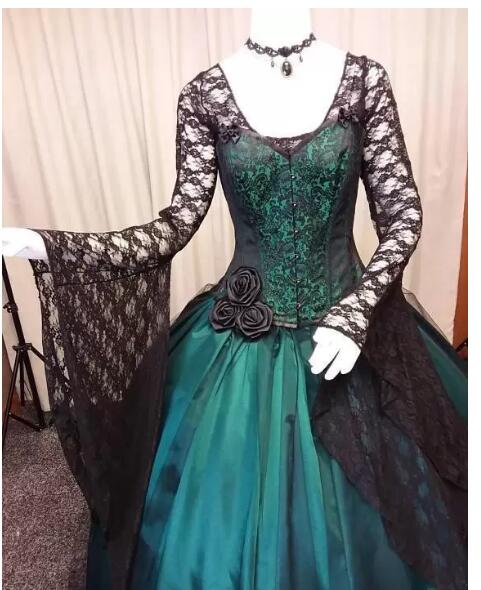Vintage Black and Green Gothic Wedding Dress 2019 Long Sleeve Steampunk Victorian Whitby Goth Lace up Plus Size Wedding bridal gown