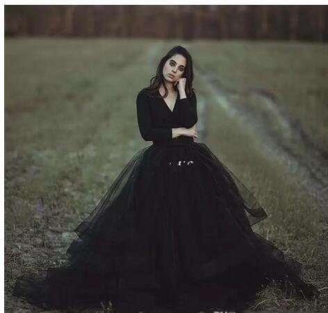 Modest Black Country Wedding Dresses Ball Gown V Neck Long Sleeve Puffy Tutu Simple Gothic Bridal Garden Outdoor Wedding Gowns