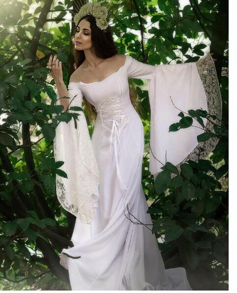 Fariytale White Medieval Boho Wedding Dress With Long Sleeve Off The Shoulder Lace Bohemian Country Civil Bride Dress Bridal