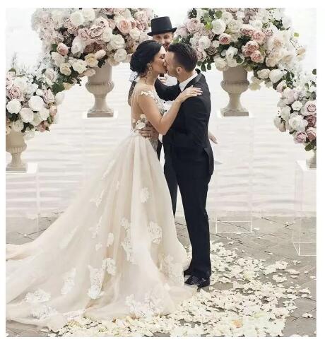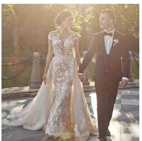 Elegant Detachable Train Lace Mermaid Wedding Dress Sexy Backless Appliques Short Sleeve Champagne Wedding Dresses