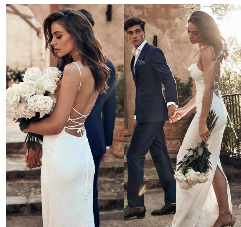 Summer Beach Boho Mermaid Wedding Dresses Bohemian Lace Appliques Long Custom Made Spaghetti Back Split Train Bridal Gowns