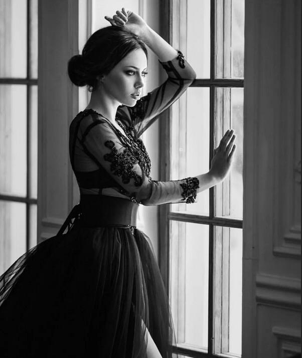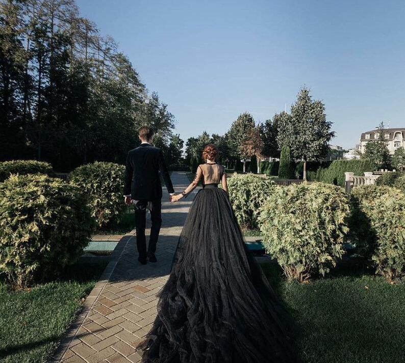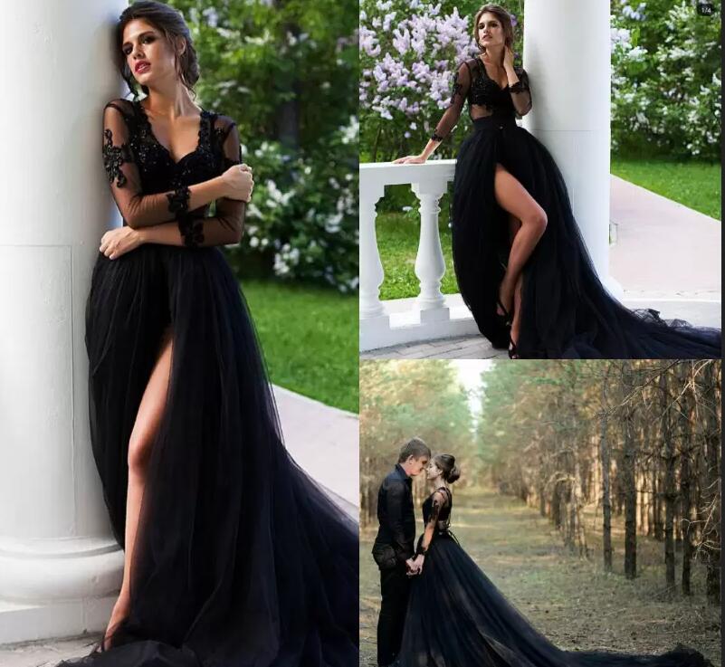 Rustic Country Black Gothic Wedding Dress V-neck Illusion Top Lace Long Sleeves Fall Tulle Wedding Dress