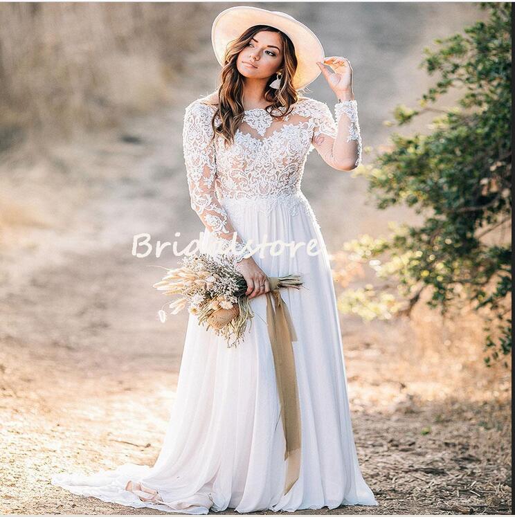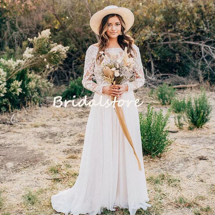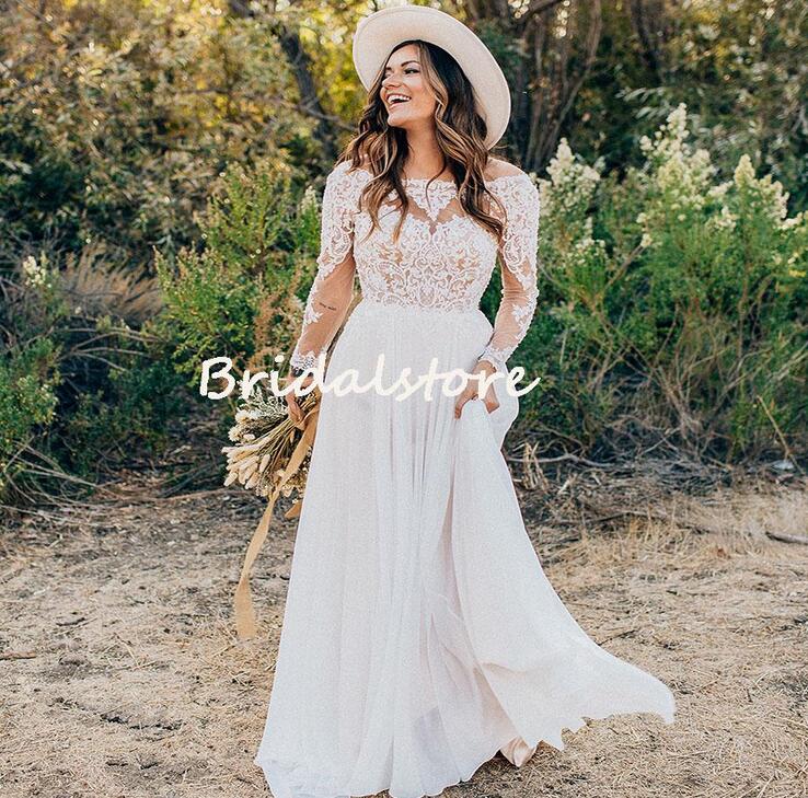 Chiffon Country Wedding Dress With Lace Long Sleeves Boho Wedding Dresses Jewel Neckling Women Bridal Gown