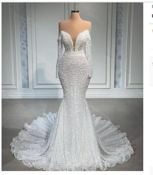 Heavy Pearls Illusion Mermaid Wedding Dresses For African Women 2022 Sheer Beads Bridal Gown With Long Train Vintage Long Sleeves Robe De Mariage
