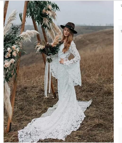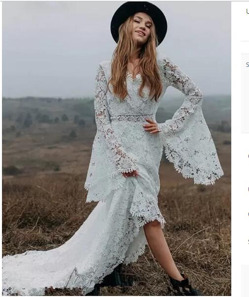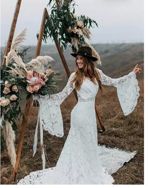 French Macrame Lace Wedding Dresses with Long Bell Sleeves 2022 V-neck Backless Bohemain Country Beach Hippie Bride Dress