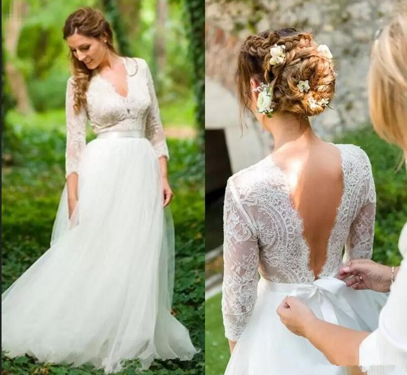 Vintage Long Sleeve Wedding Dresses 2020 V-neck Lace Tulle Low Back Bohemian Country Beach Holiday Bride Wedding Dress