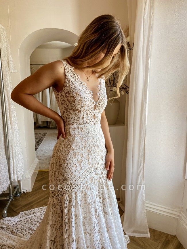 Modest Long Mermadi V-neck Open Back Lace Wedding Dress
