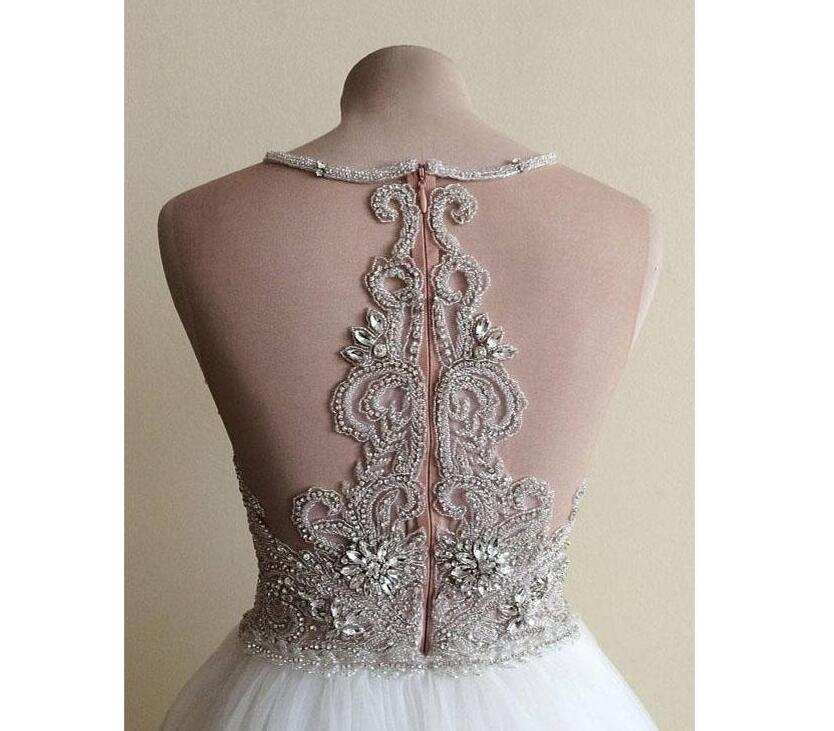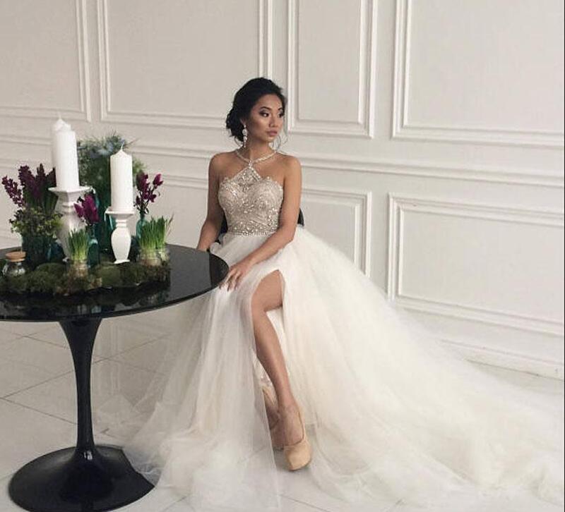 crystal beaded wedding dresses real photos halter aline tulle high split bridal gown