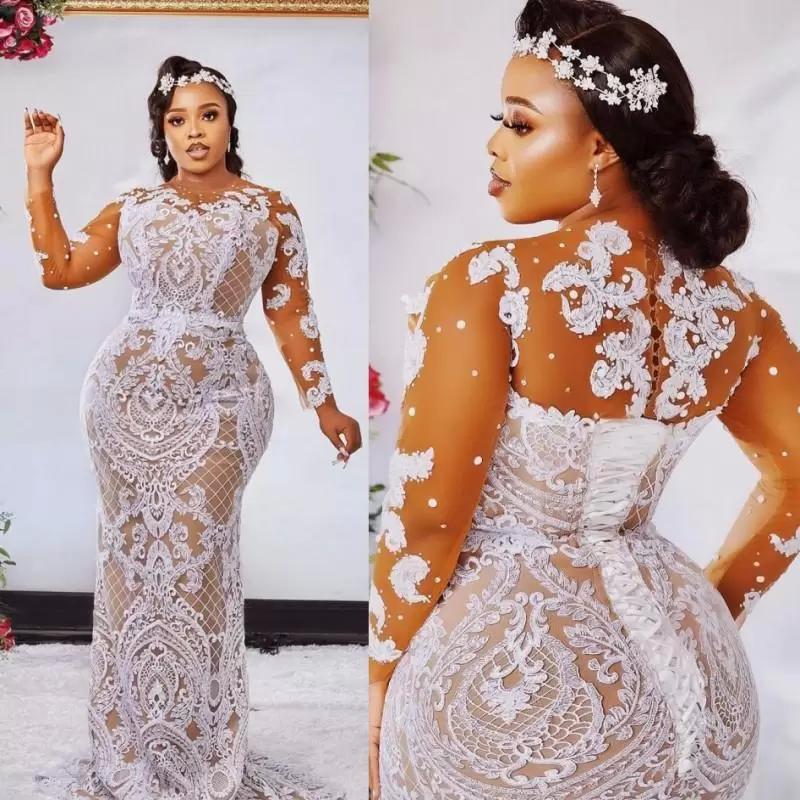 Fashion Plus Size Mermaid Lace Wedding Dresses Sheer Bateau Neck Long Sleeves Beaded Bridal Gown