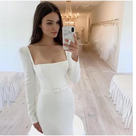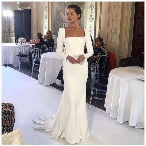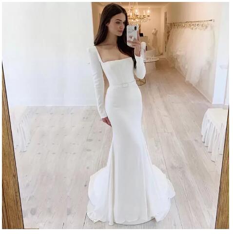 Simple Square Neck Mermaid Wedding Dresses Long Sleeve Satin Bridal Dress Sweep Train With Belt Country Bridal Gowns