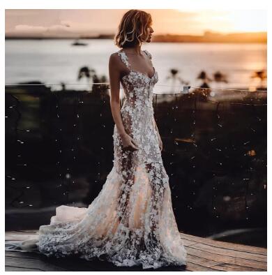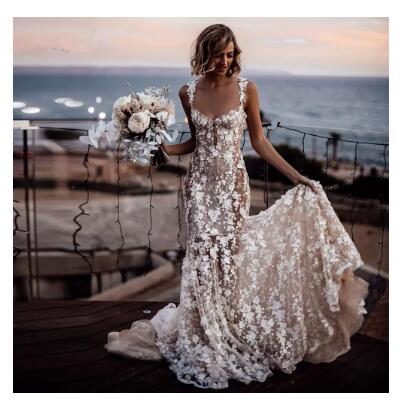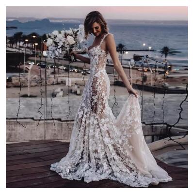 Beach Mermaid Wedding Dresses Sexy Nude Lining Floral Lace Applique Country Bohemian Sweetheart Bridal Gown vestido novia berta