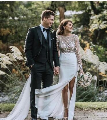 Long Sleeve Sheer High Neckline boho Wedding Dresses 2019 A Line White Lace Tulle Bridal Gowns Fashion Vestido De Noiva