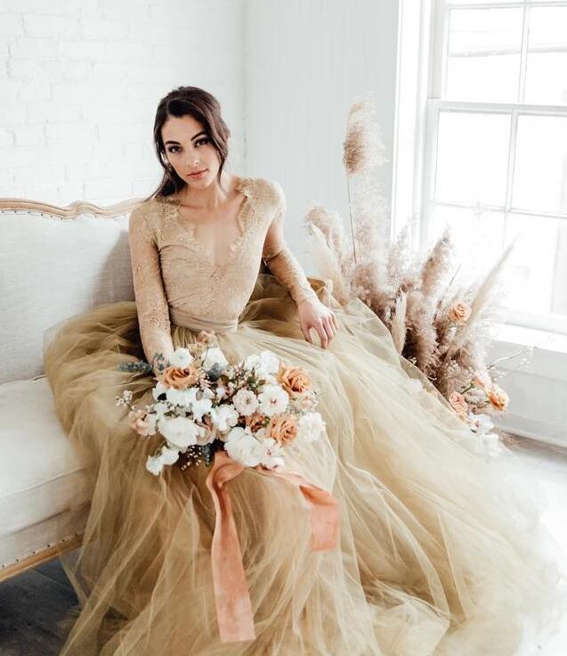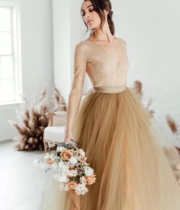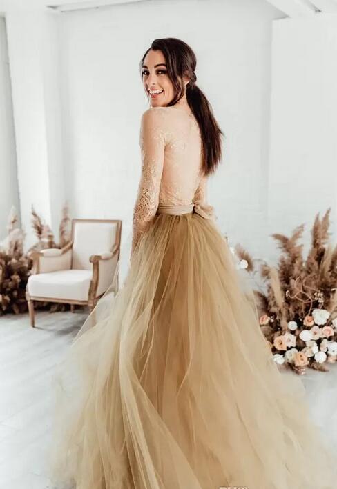Vintage Gold Wedding Dresses V Neck Lace Appliqued Tulle A Line Long Sleeves Gothic Wedding Gown