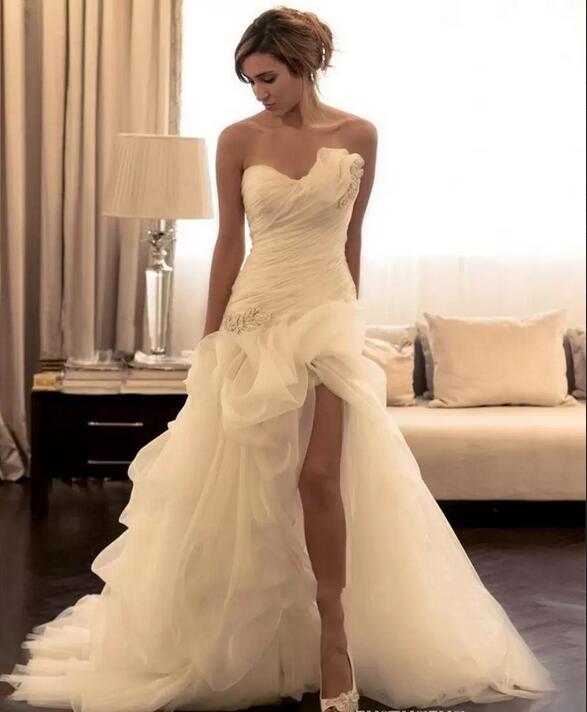 Chic Sexy Wedding Dresses Lace Side Split Sweep Train Beads Sweetheart Beach Wedding Gown
