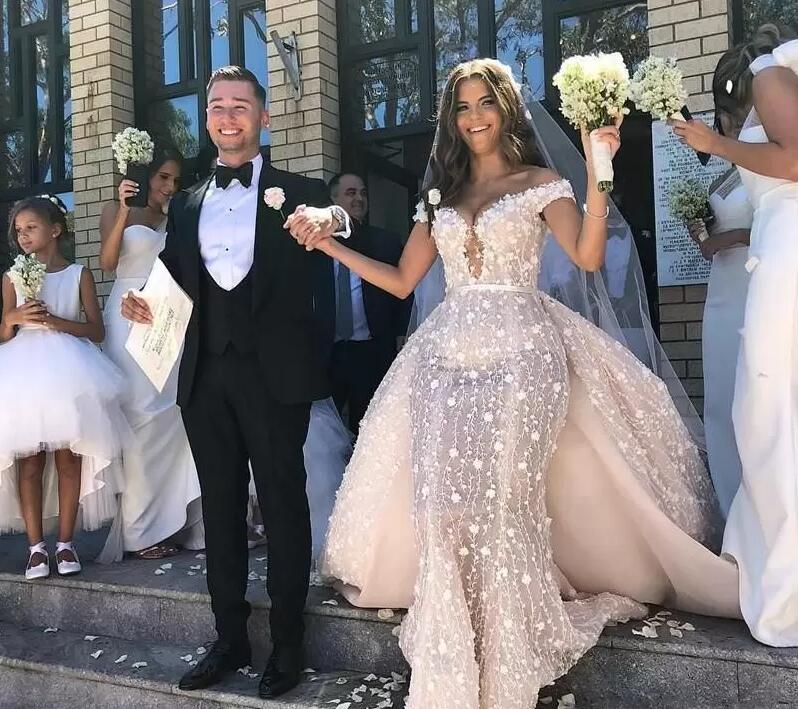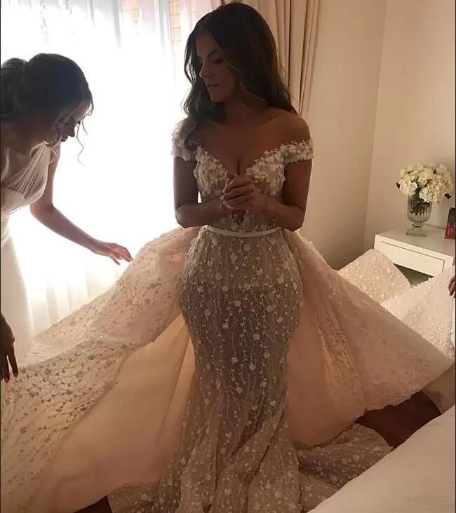 Saudi Arabia Full Lace Mermaid Wedding Dress With Detachable Train Sexy Off The Shoulder 3D Floral Bridal Gown