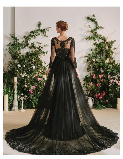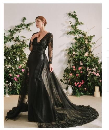 Gothic Black Mermaid Wedding Dresses With Detachable Overskirt Lace Long Sleeve Robe De Mariee Deep V-Neck Vintage Bridal Gowns Beaded