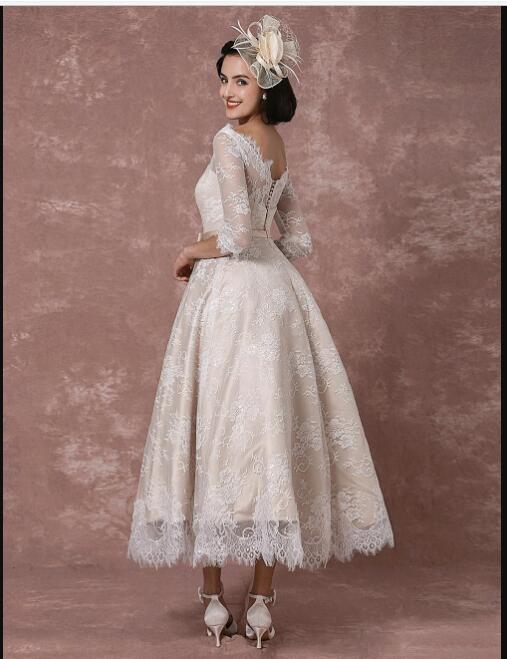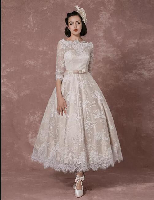 Vintage Champagne A Line Lace Wedding Dress Half Sleeve Tea Length Retro Country Bridal Gowns Open Back Bateau Neck Bride Wedding Dresses