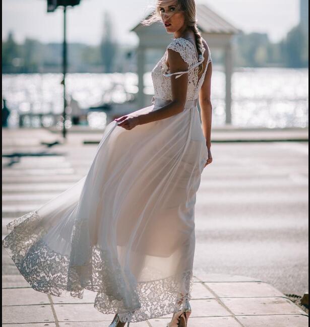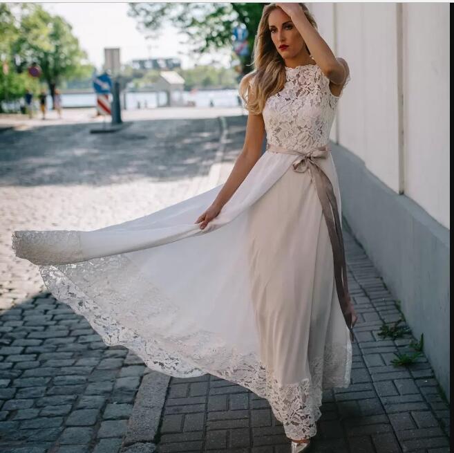 Boho Wedding Dresses with Ribbon Long A Line Bridal Gowns Sexy Backless Long Lace Chiffon Robe De Marrige