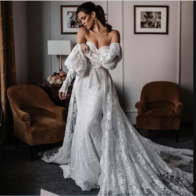 Mermaid Wedding Dresses with Detachable Train Lace Sweetheart Boho Marriage Robe De Mariee Removable Long Sleeves