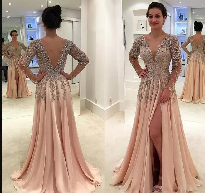 Gorgeous Crystals Backless Dresses Evening Wear Deep V Neck Beaded Prom Gowns Floor Length A Line Chiffon Split Side Formal Dress