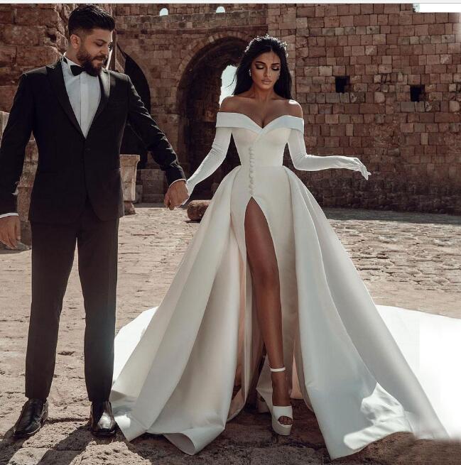 Graceful Mermaid Wedding Dresses Off The Shoulder Neck Bridal Gowns With Detachable Train Side Split Satin Vestido De Novia