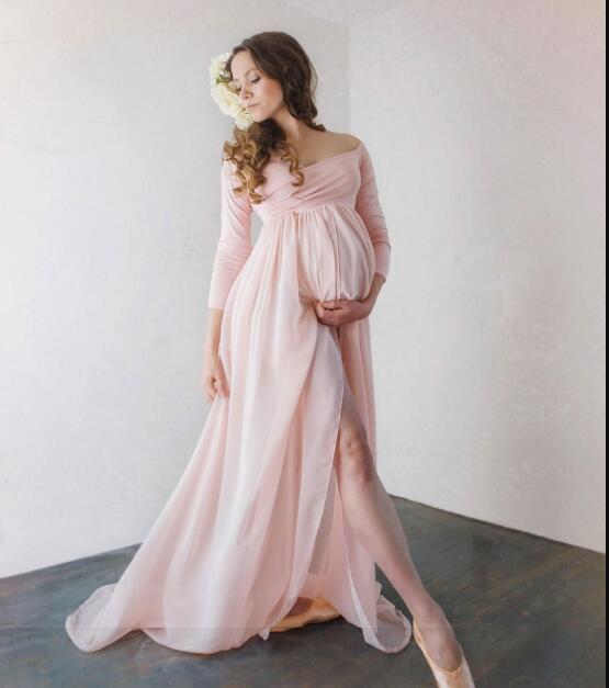 Attractive Chiffon Maternity Dresses For Photo Shoot With Long Sleeves Split Front Pregnant Gown Off The Shoulder Custom Made Maxi Dress