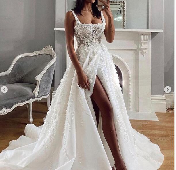 3D Handmade Flower SIde Slit Scoop Wedding Dresses Bridal Gowns
