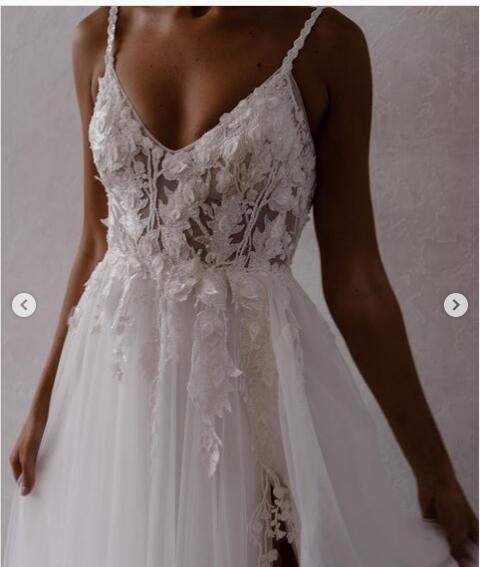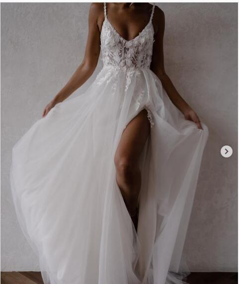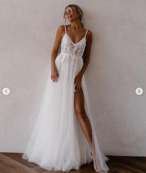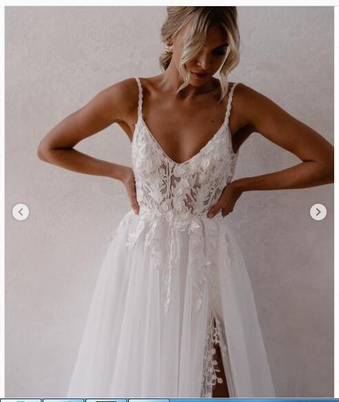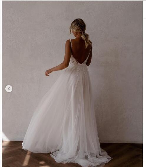 Simple A Line Tulle Handmade Flowers Lace Beach Boho Wedding Dresses Bridal Gowns