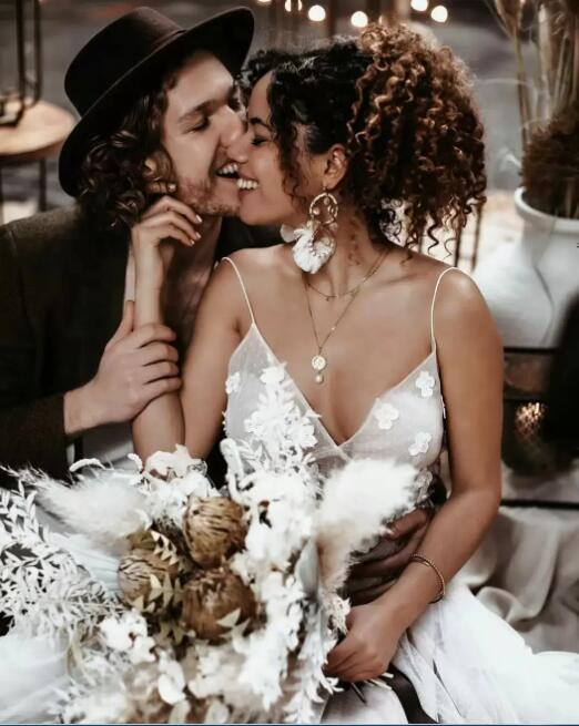 Handmade 3D-Applique Bodice Bridal Gowns Spaghetti V Neck Wedding Dresses