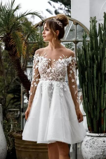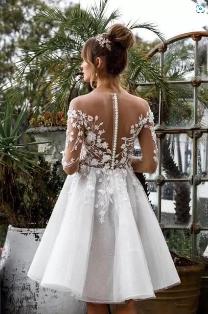 Summer Short Tulle A Line Wedding Dresses Sheer Neck Lace Applique Long Sleeves Vestidos De Novia Buttons Back