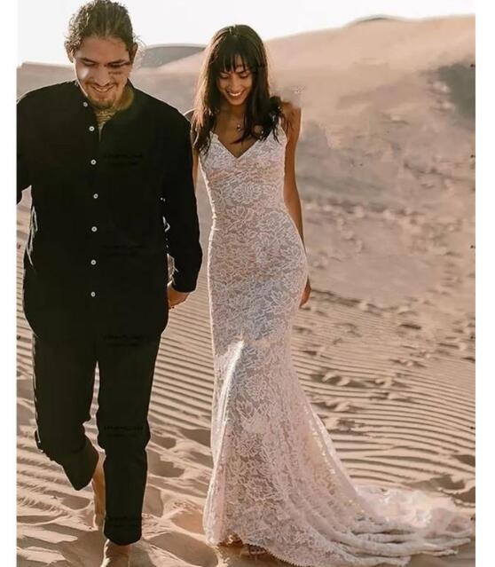 Beach Bohemian Wedding Dresses Full Lace Fariy Tail Mermaid Backless Outdoor Boho Bridal Gowns