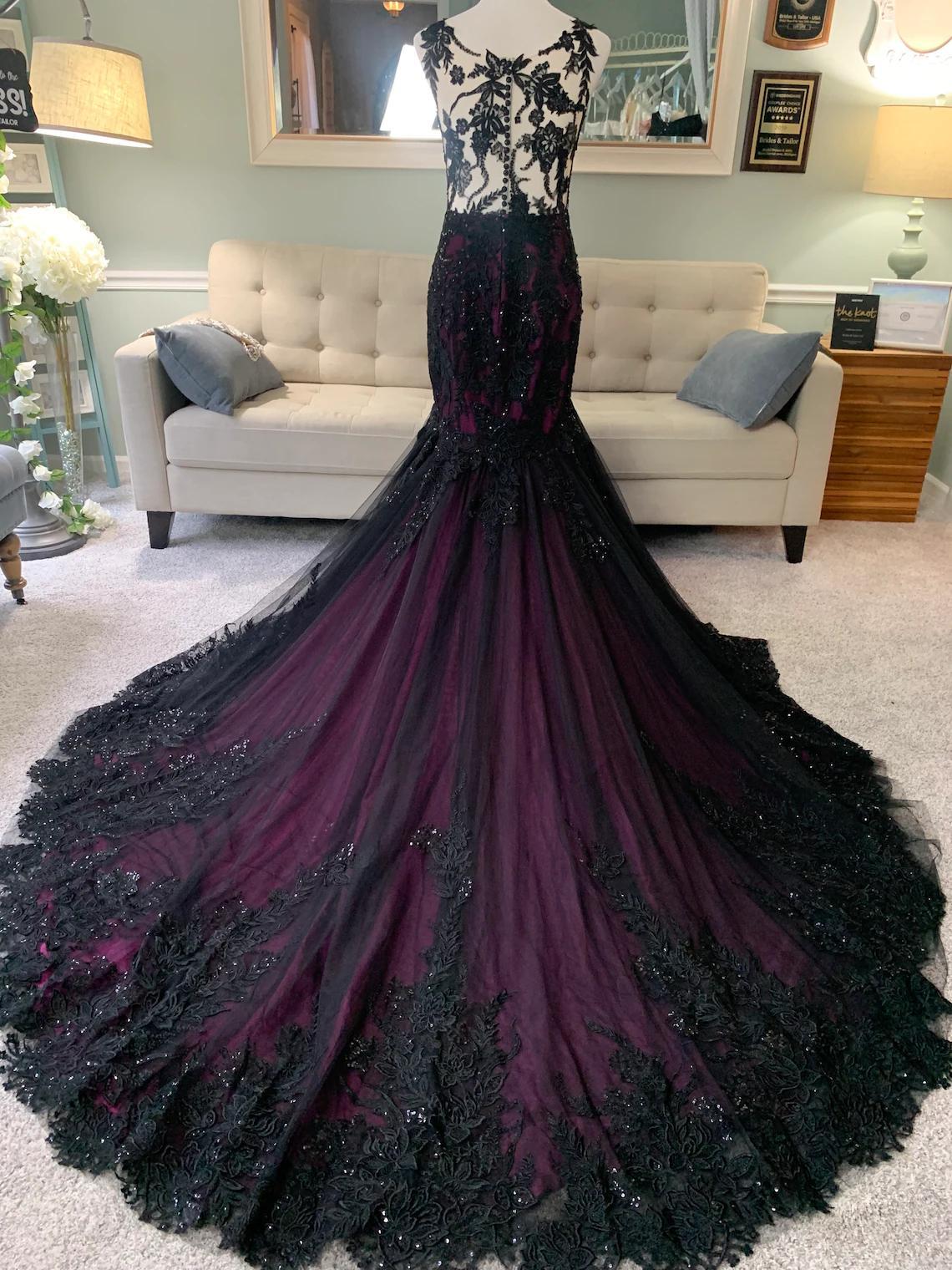 Vintage Purple and Black Mermaid Wedding Dresses Gothic Applique Beaded Sheer Neck Covered Buttons Bridal Gown Robe De Mariage
