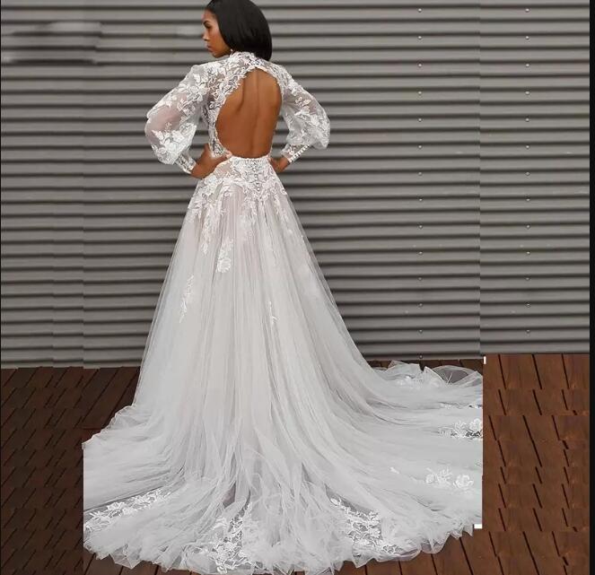 Charming Embroidery Lace Wedding Dresses Puffy Long Sleeve Bridal Gown Side Split Hollow Back Marriage Robes