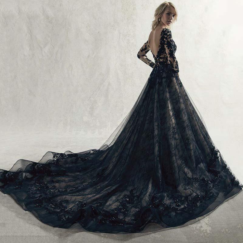 Vintage Black Lace Wedding Dress Long Sleeve Deep V Neck A Line Forrset Bridal Gowns Sexy Backless Court Train Gothic Wedding Dresses