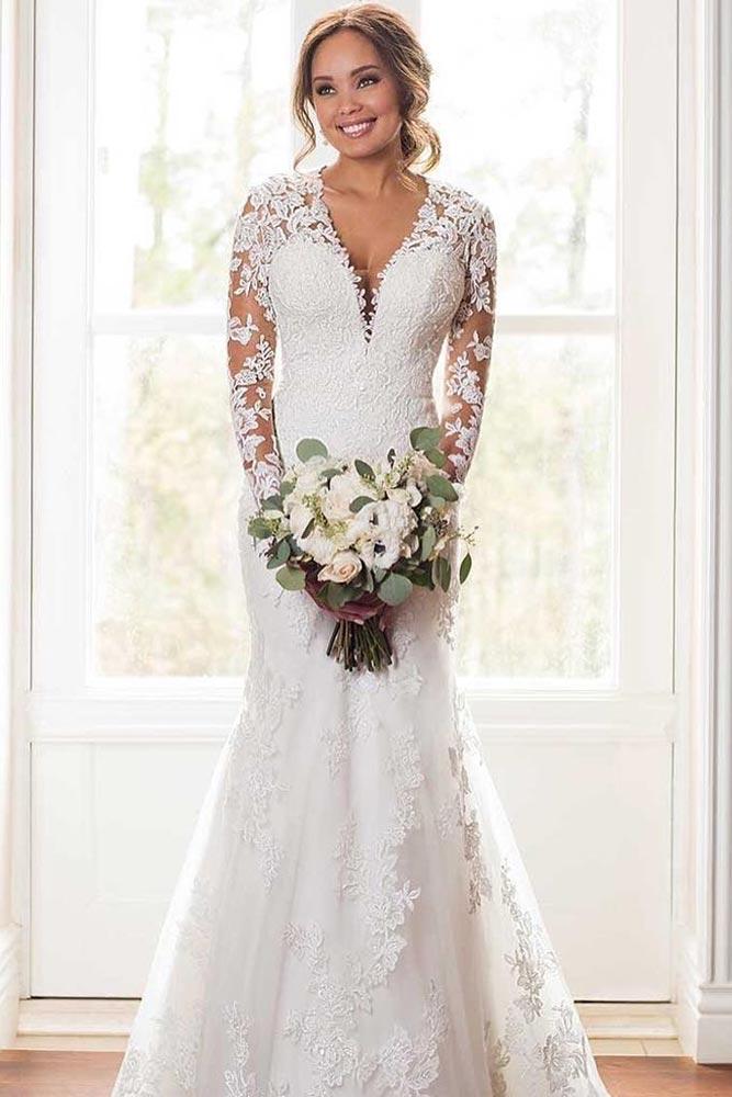 Graceful Long Sleeve Lace Mermaid Wedding Dresses Appliques V Neck Ivory Bridal Gowns Sweep Train Back Zipper Spring Country bride Wedding Dress