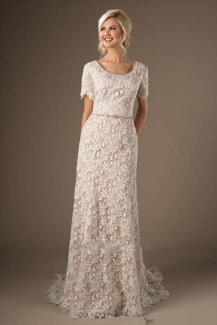Champagne Modest Wedding Dresses Lace Gowns With Short Sleeves Scoop Neck Vintage Buttons Back Boho Bridal Gowns Vestidos Bohemian