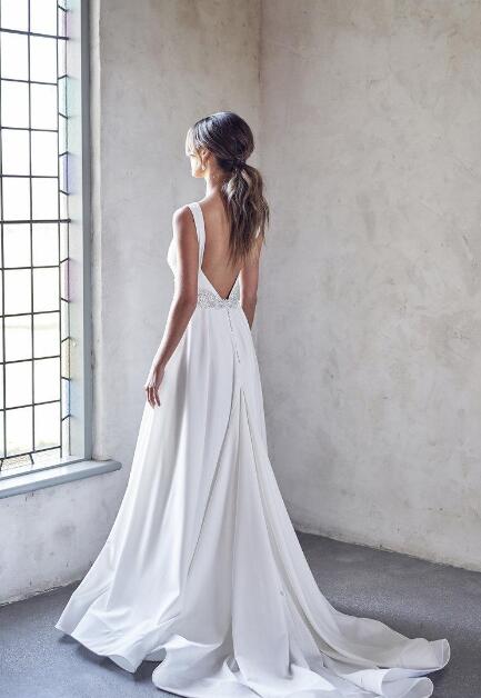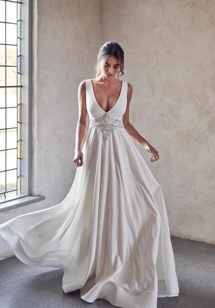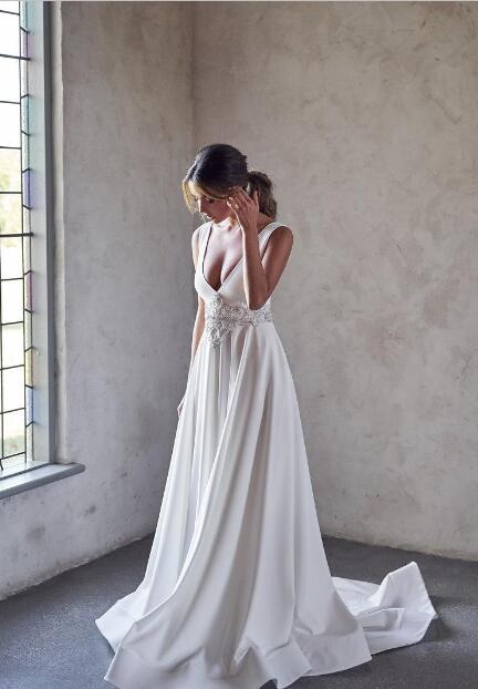 A Line Wedding Dresses Beaded Lace Applique V Neck Boho Satin Long Bridal Gowns Backless Country Style Beach Wedding Dress