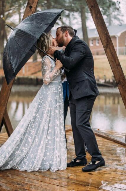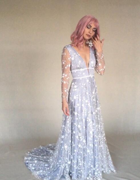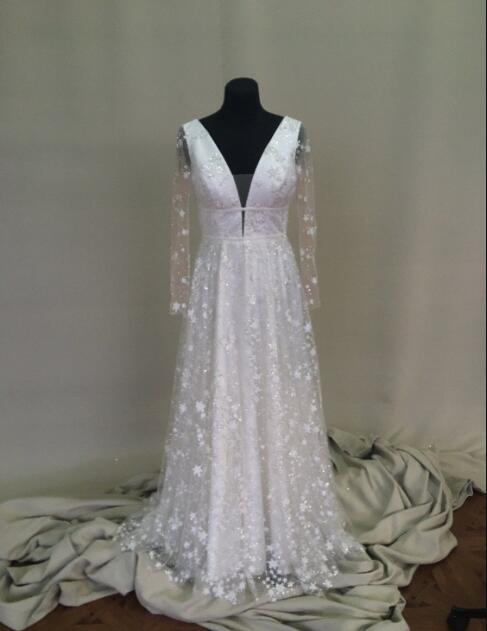 Long Sleeve Boho Wedding Dress Star Sequined A Line Beach Bridal Gowns Sexy Deep V-Neck Country Bride Dresses Romantic Robe De Mariage