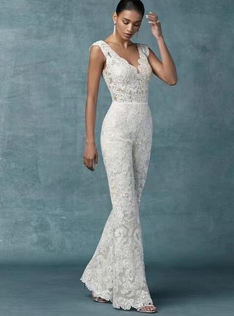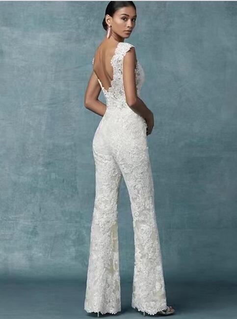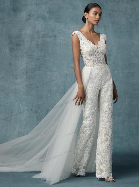 Boho Lace Bridal Gowns Wedding Jumpsuit With Detachable Skirt Appliques V Neck Sleeveless Exquisite Country Wedding Dresses