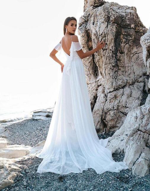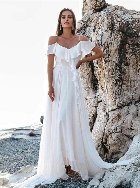 Vintage White Chiffon Ruffles Wedding Dress Summer Long Boho Bridal Gowns Off The Shoulder Formal Robe De Mariée Open Back Beach Bride Dresses